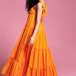 The charming tiered ruffle Kassia dress is made from soft organic cotton and features a flatering square neckline and wide tie-back straps. In a vibrant tangerine hue, it radiates warmth and style. The playful ruffles add movement and femininity making it perfect for long sunny summer days. Effortlessly chic, wear it after pool dips with sandals and you’re ready for drinks by the bar!