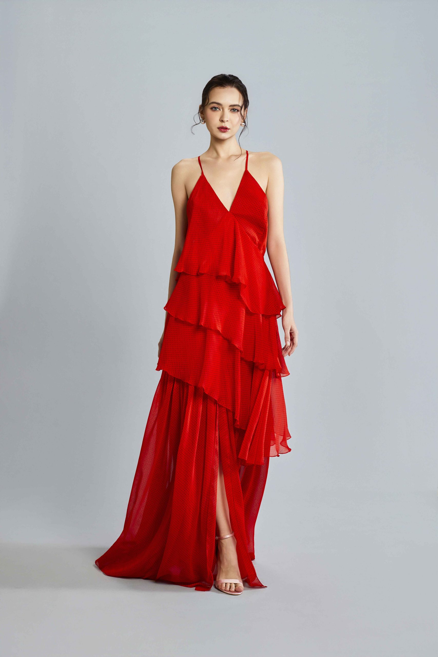 Gorgeously layered chilli red chiffon with black polka dots and delicate halter tie-back straps creates the most flattering silhouette in the Lilly dress. Light, airy tiers sway with every step for a romantic ethereal silhouette perfect for afternoon soirées, garden wedding and sunset receptions. Subtle shimmer catches the light for a dreamy finish. Style with metallic strappy heels to complete the look.