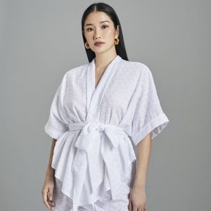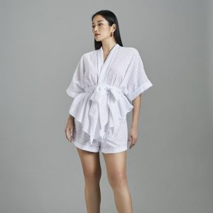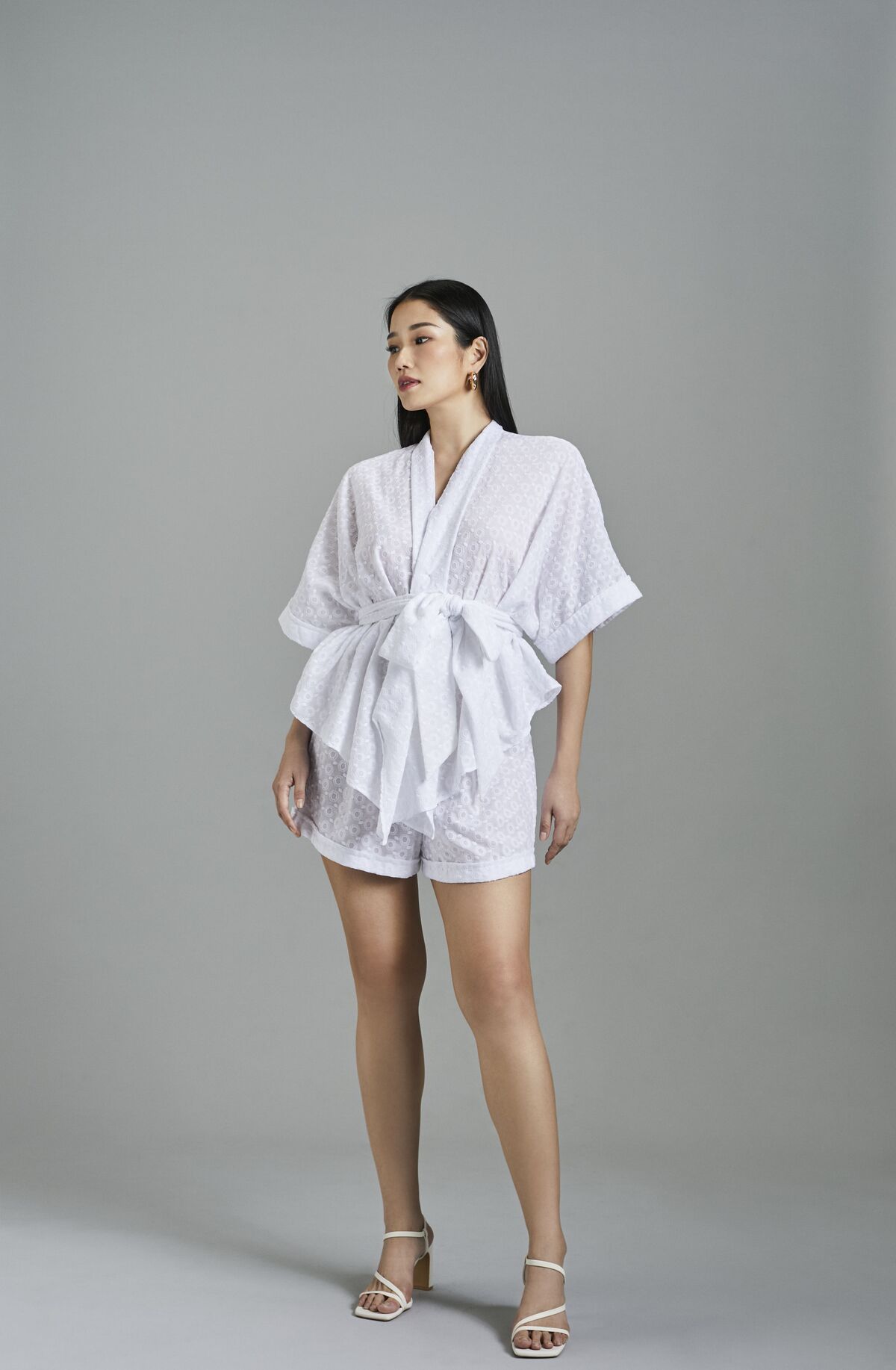 The Mila two piece set features a kimono style blouse and shorts in intricate Embroidery Anglaise fabric. The blousev has a flowy silhouette with wide sleeves and includes a sash to cinch the waist for a more defined look or worn without for a relaxed fit. The shorts, with a wide elastic waistband, ensures comfort and ease of wear. Elegant and comfortable, the Mila set is the ultimate holiday wear!