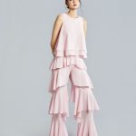 The Somara ensemble features a black sleeves top and matching pants set designed with a playful and elegant flair. The top showcases a double tiered design that flows gracefully, offering a relaxed yet sophisticated look. The high waisted pants with multiple cascading ruffles, a signature style of the brand adds volume and movement to the outfit. The playful silhouette enhances its fluidity, making it perfect for a stylish and modern statement. Ideal for cocktails under the summer sky, the Somara set combines comfort with a touch of glamour.