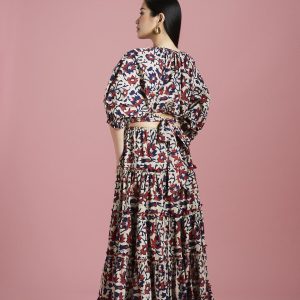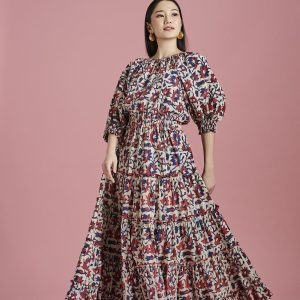 The multicoloured Soraya midi dress features jewel tones in the softest organic cotton. The softly gathered open back bodice adds a beautiful details with a tie sash while the fabrication’s lightweight organic cotton offers the most comfortable wearable fit. Our signature billowing balloon sleeves and voluminous tiered skirt stays true to the brand’s aesthetics and adds a beautiful silhouette, perfect for a day to night outfit.